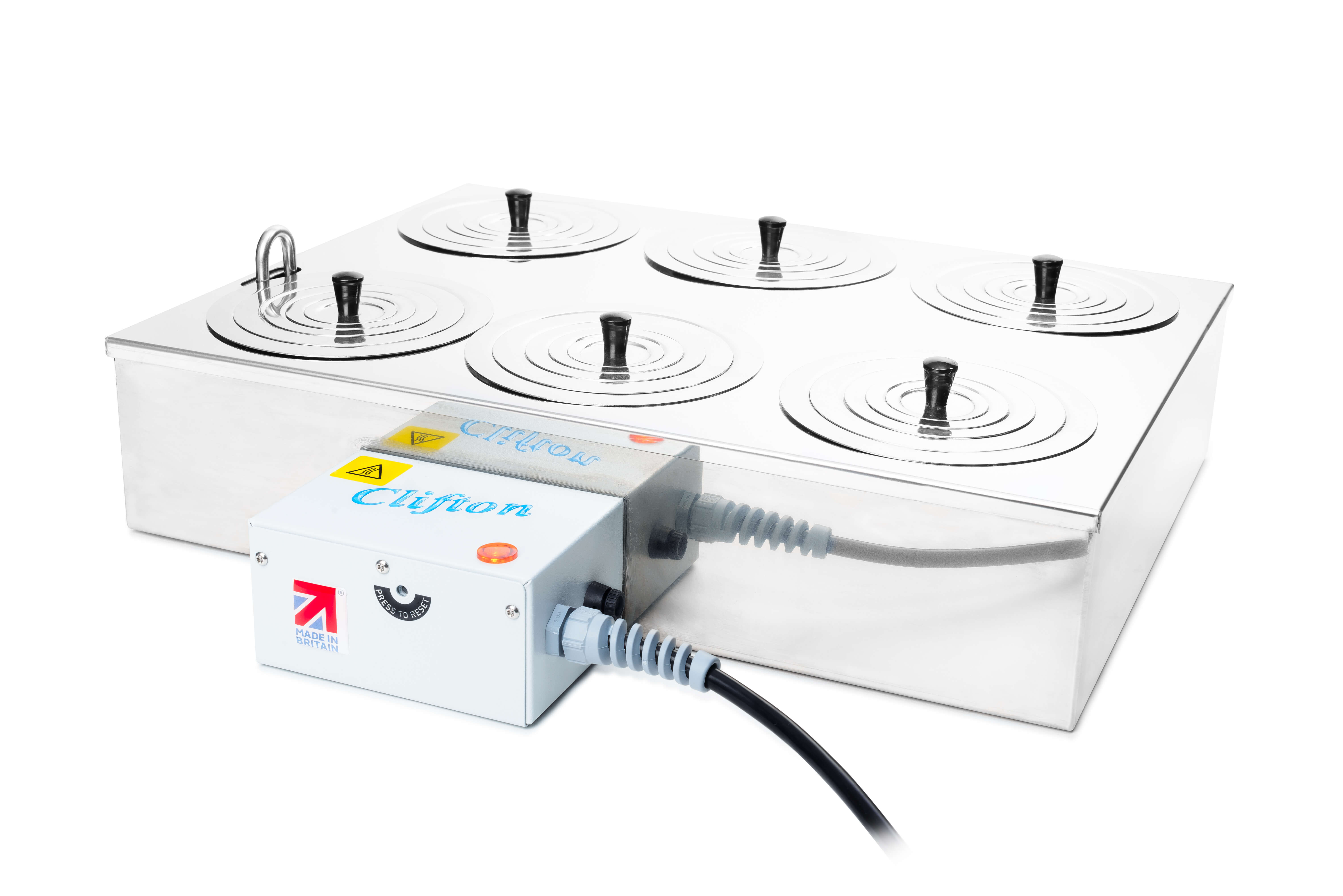 These baths provide constant boiling water for gentle heating of samples by steam. Always place the boiling bath on a heat proof surface. Power on indicator.