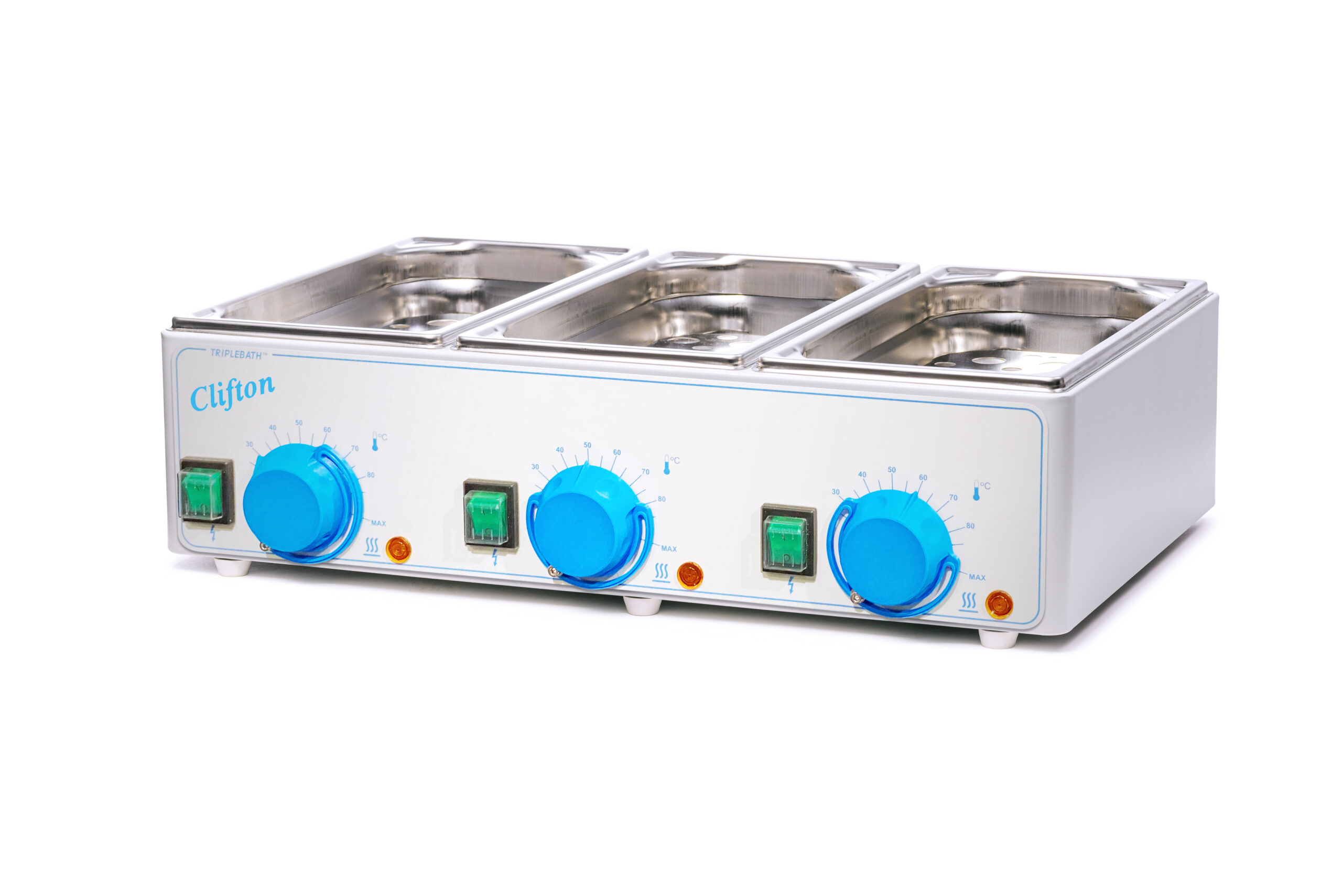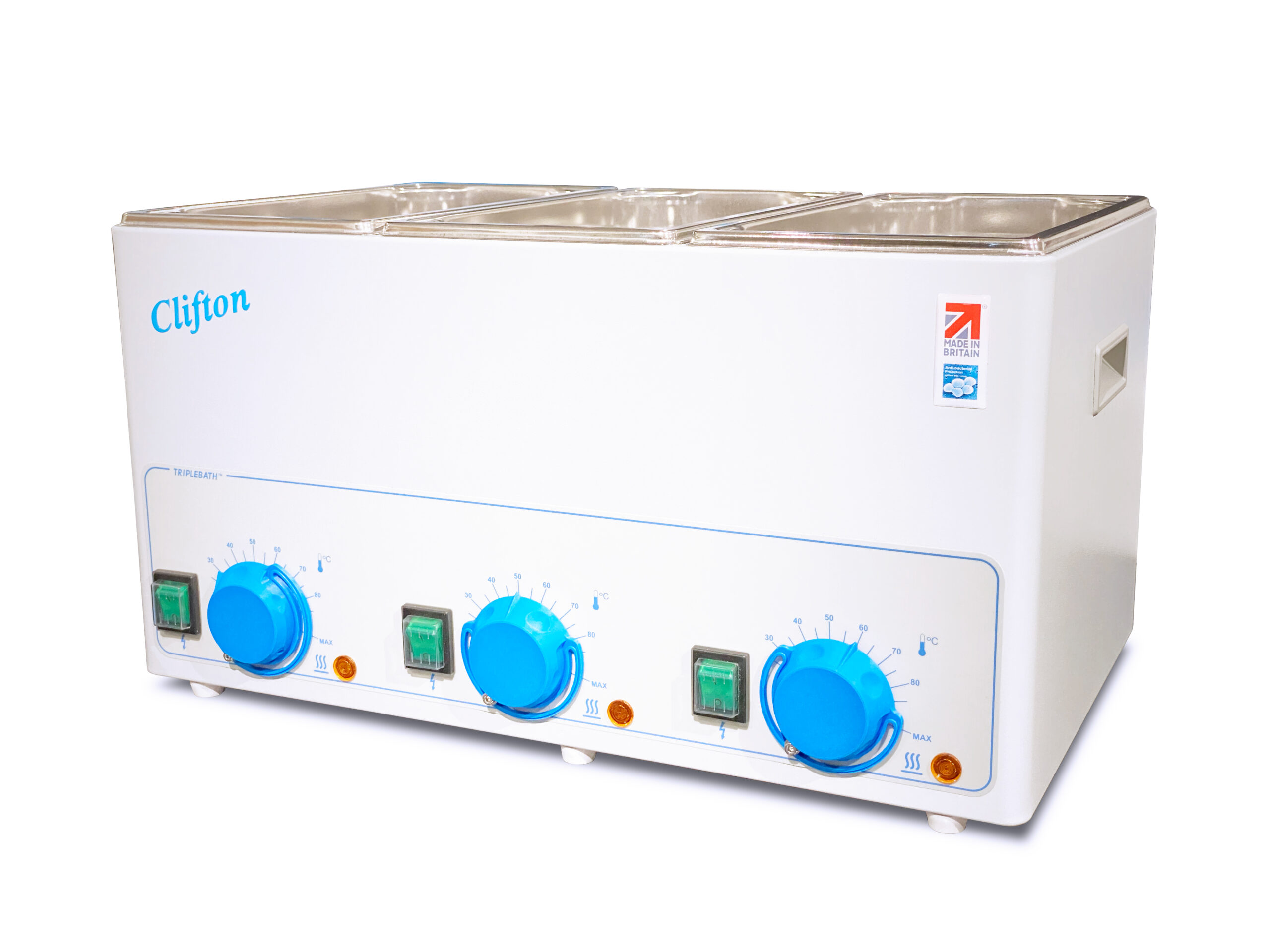• Clifton shallow height water baths operate with low liquid levels suiting small bottles, tubes and micro plates.